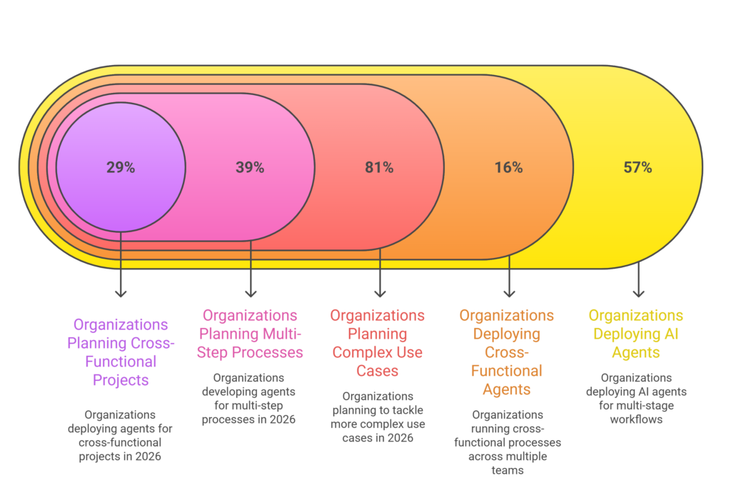 More than half of organizations (57%) now deploy AI agents for multi-stage workflows, with 16% running cross-functional processes across multiple teams. In 2026, 81% plan to tackle more complex use cases, including 39% developing agents for multi-step processes and 29% deploying them for cross-functional projects.